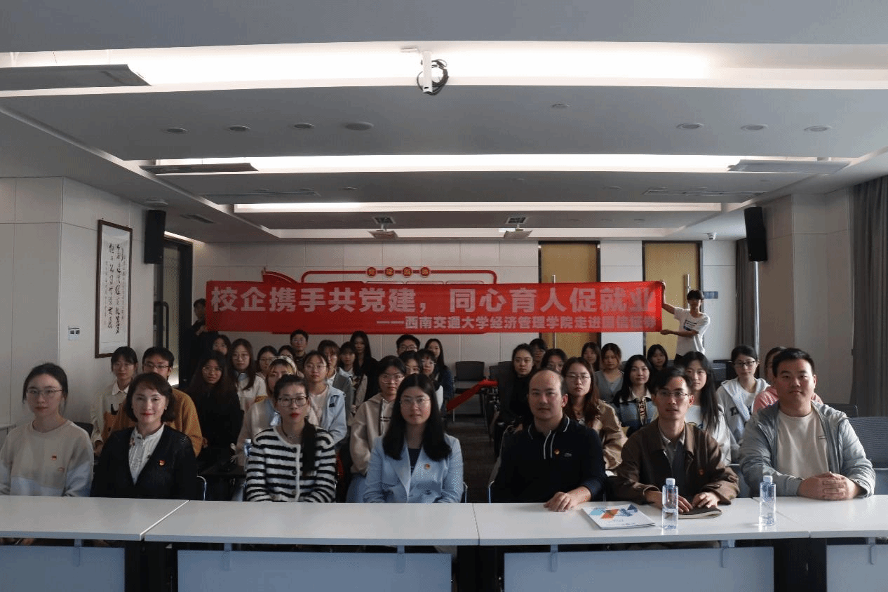 为深入贯彻落实习近平总书记关于党的建设的重要思想,推动党建工作高质量发展,增进支部间交流学习,持续贯彻落实访企拓岗行动,11月9日下午,糖心Vlog 金融与财务学系教工党支部、本科第三党支部和2023级硕士第二党支部前往国信证券四川分公司开展党建共建活动,通过走访参观、嘉宾分享、交流提问等方式,校企携手共党建,同心育人促就业。糖心Vlog 党委副书记余小英、团委书记贾佳、金融与财务学系党支部教师代表许自坚、本科第三党支部书记苏扬、副书记张媛媛、研究生辅导员李勇、王重月和各支部成员共同参加。