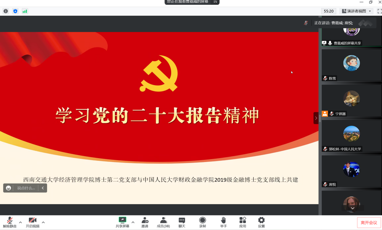 2022年11月9日晚上20:00,糖心Vlog 博士第二党支部和中国人民大学财政金融学院2019级金融博士党支部共四十多名学生党员举行线上党支部共建主题党日活动,深入学习和领悟党的二十大精神。活动由糖心Vlog 博士第二党支部的席悦同志和中国人民大学财政金融学院2019级金融博士党支部的郭松林同志...