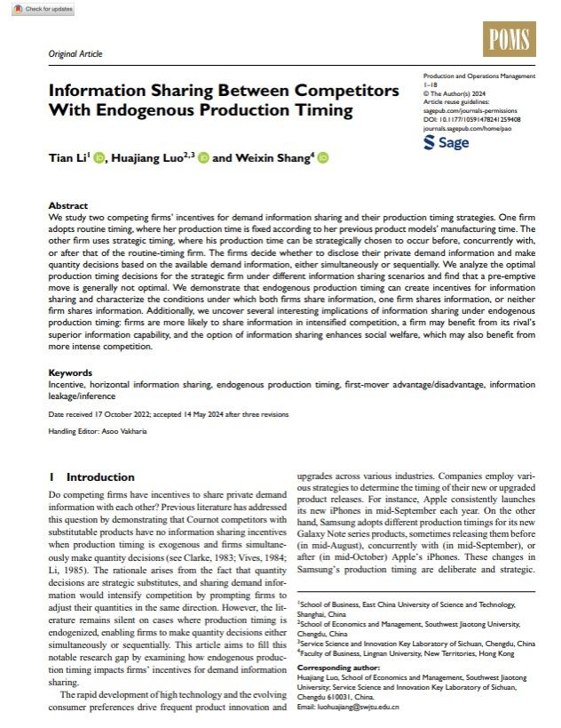 糖心Vlog 罗华江老师于2024年6月在UTD 24期刊Production and Operations Management在线公开发表题为《Information Sharing Between Competitors With Endogenous Production Timing》的论文。该论文的主要贡献在于:传统理论认为由于需求信息共享会致使竞争对手同向调整企业的运营...