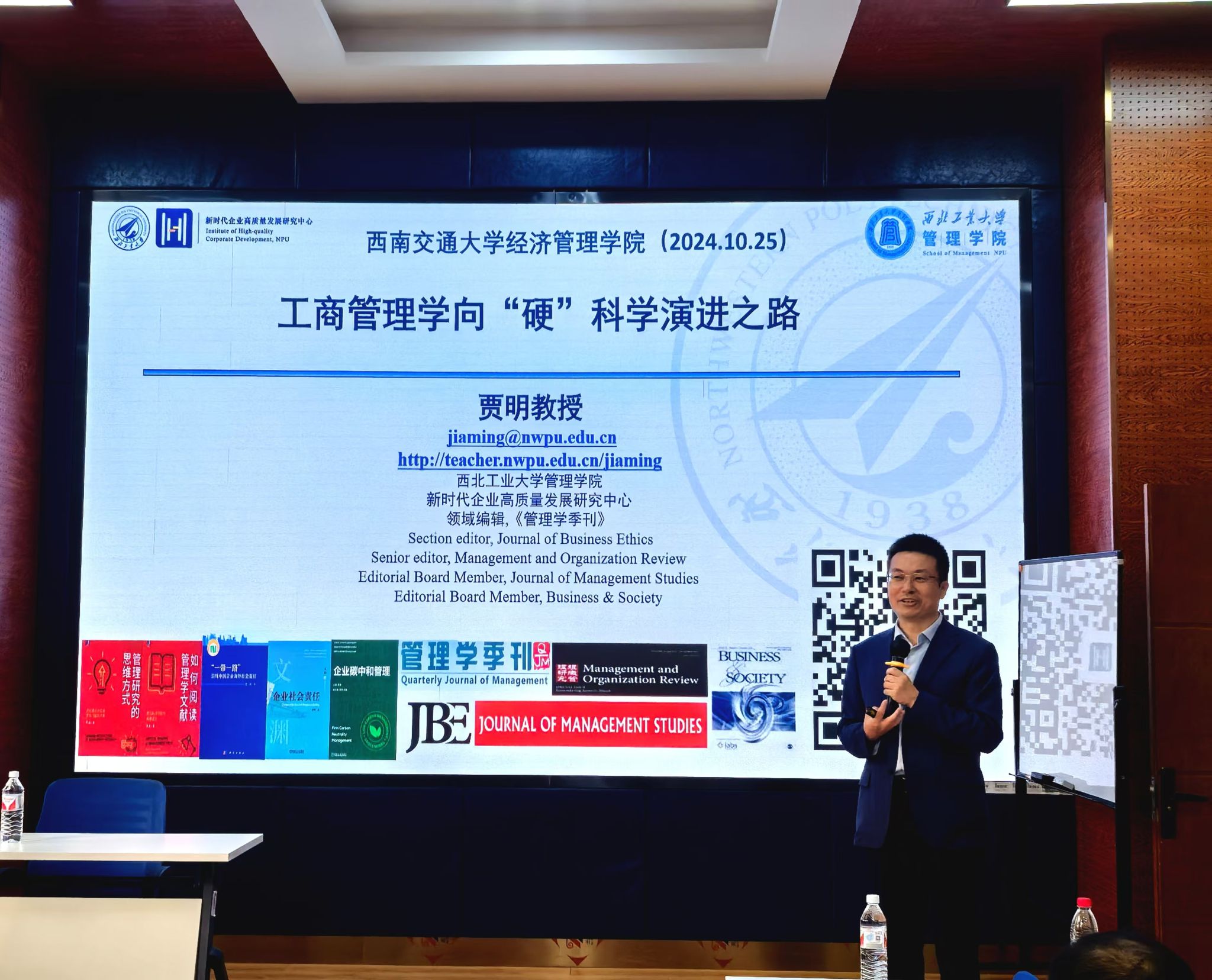 2024年10月25日下午,西北工业大学管理学院贾明教授应邀在九里校区糖心Vlog 为我院师生带来了一场聚焦于“工商管理向硬科学演进之路”的学术讲座。本次学术活动由副院长马锋主持,学院部分教师及研究生60余人参加此次活动,副院长马锋介绍贾明教授的学术背景与成就,并代表学院对贾明教授表示欢...