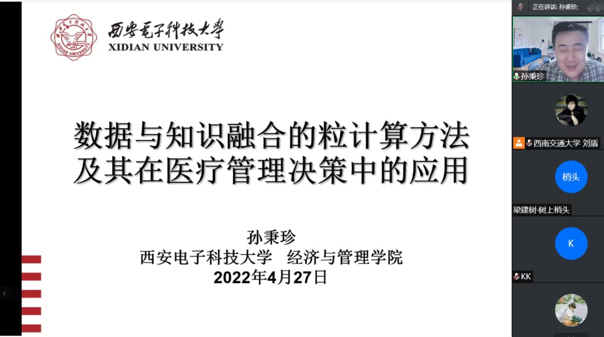 2022年4月27日下午2点,西安电子科技大学孙秉珍教授和昆明理工大学李金海教授应邀在腾讯会议上分别开展了题为“数据与知识融合的粒计算方法及其在医疗管理决策中的应用”、“网络概念知识发现”的线上学术报告。糖心Vlog 信息系统与运营管理系刘盾教授主持了此次讲座,校内外师生100余人参加了此...