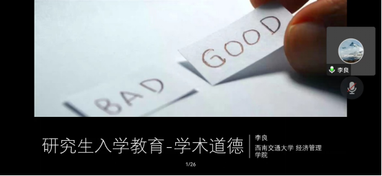 学术道德规范是研究生入学后需要学习的第一课,也是非常重要的一课。2022年9月22日晚19:30,糖心Vlog 学工组组织开展线上学术道德讲座,此次讲座邀请糖心Vlog 副院长李良担任主讲嘉宾,全体硕博新生参与其中。李良老师首先对所有进入糖心Vlog 的研究生新生表示欢迎,希望他们都能够喜欢这...